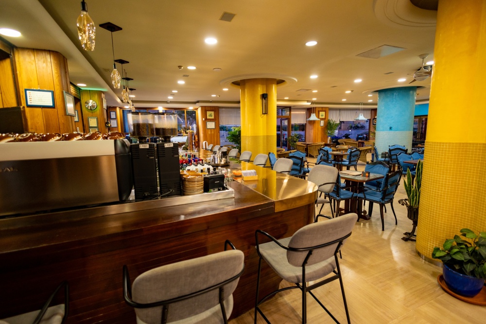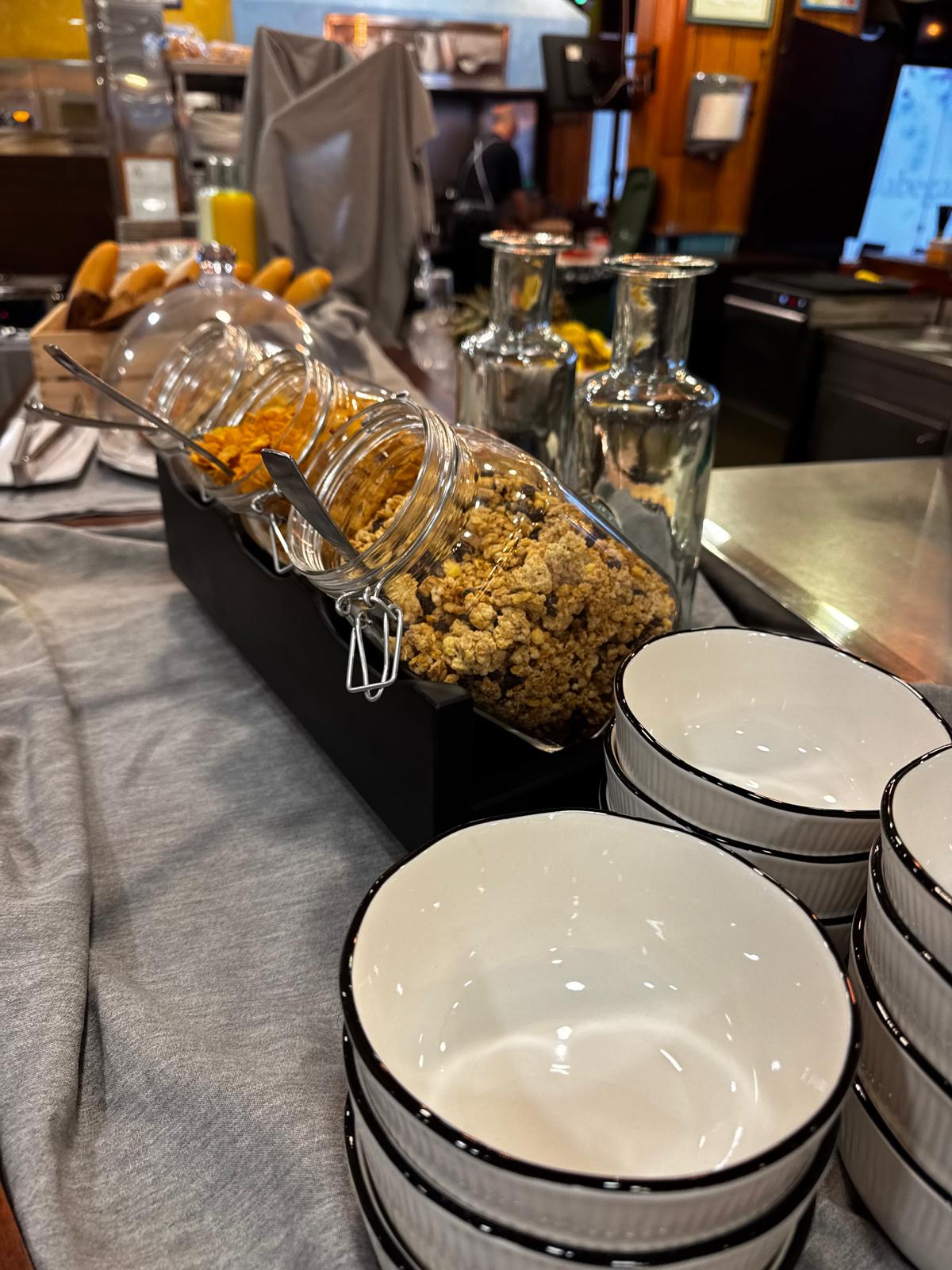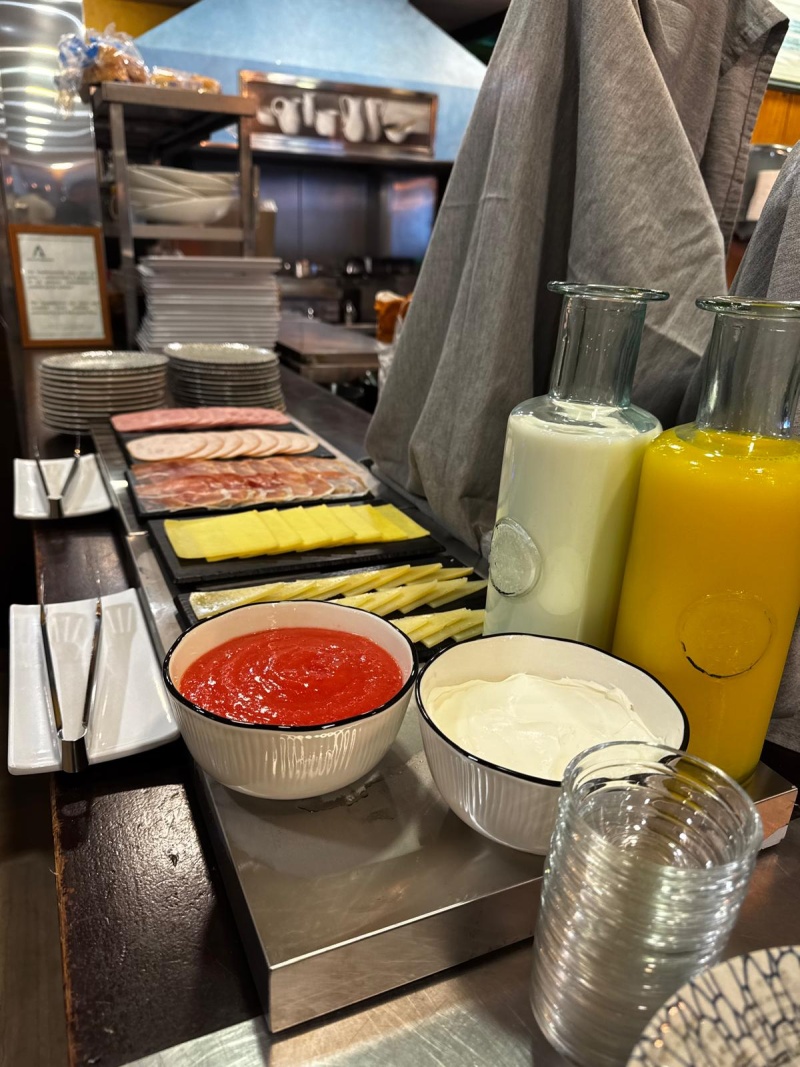 Cada mañana te espera una cuidada selección de productos frescos y de calidad: bollería recién horneada, pan, frutas, embutidos, quesos, opciones calientes, cereales, yogures, zumos naturales y café recién hecho.